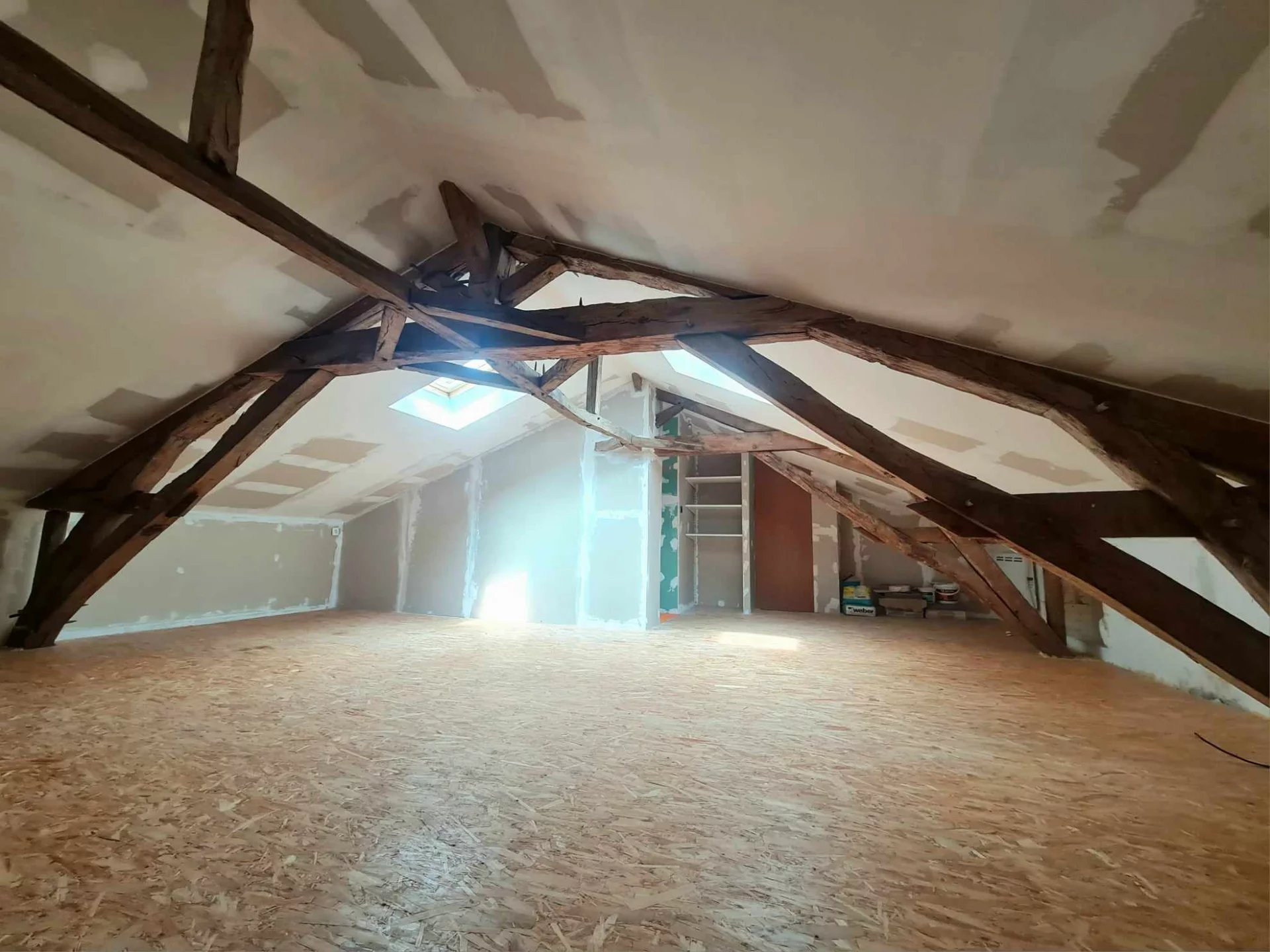Double-glazed windows, attractive parquet flooring and terracotta floor tiles, attractive roof truss.