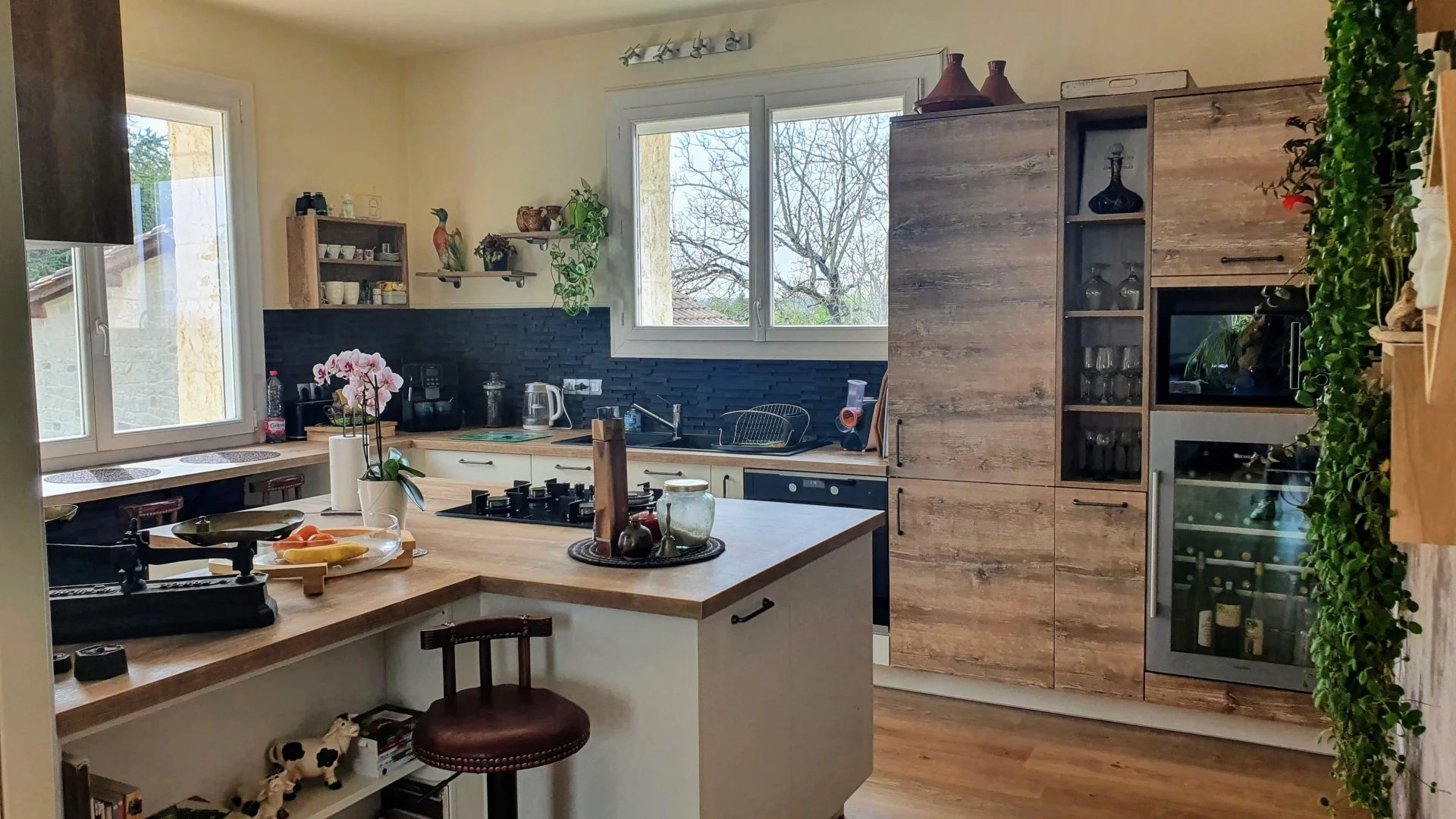 Inside, the house boasts a modern kitchen equipped with state-of-the-art appliances, designed to fulfill all culinary endeavors. The dining area, with its large windows, offers picturesque views of the surrounding landscape, enhancing every dining experience. With its blend of luxury, comfort, and charm, this property truly encapsulates the essence of elegant French living.