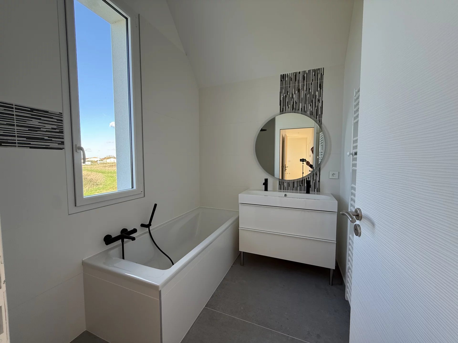 Prestations haut de gamme : carrelage 120 cm, parquet chêne, salles d’eau faïencées toute hauteur, robinetteries encastrées, menuiseries aluminium, pompe à chaleur, cuisine équipée.