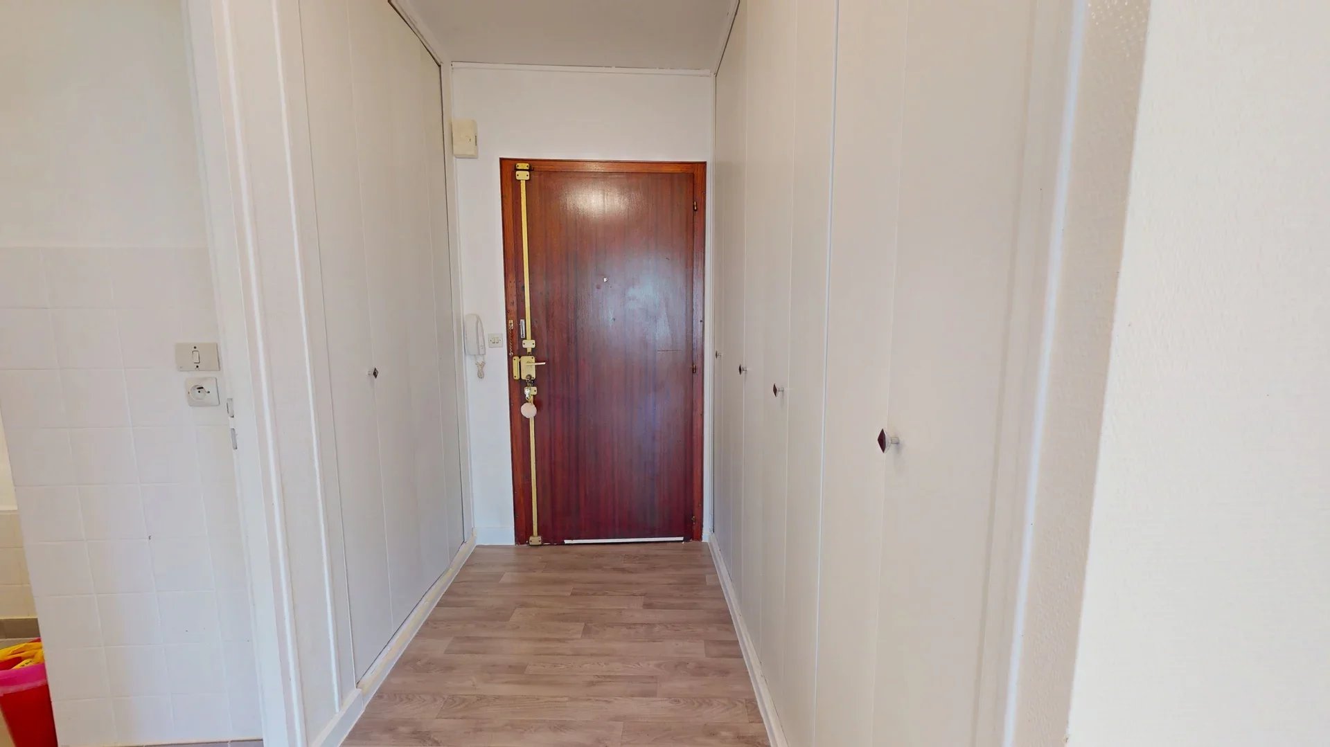 L’appartement dispose également d’une chambre spacieuse, d’une salle de bains avec baignoire, de WC séparés, ainsi que de nombreux rangements intégrés dès l’entrée.